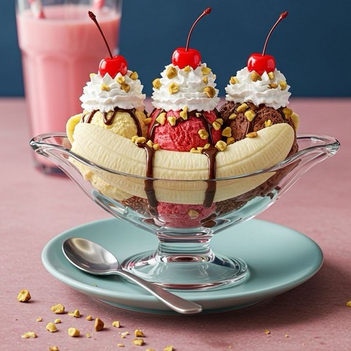 Serveret: med 3 kugler is, flødeskum, banan og toping