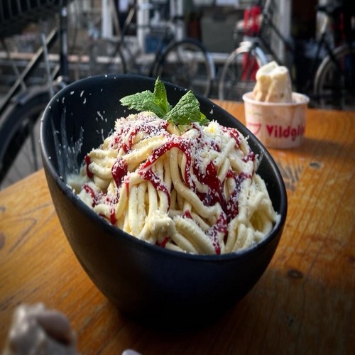 Serveret: med 3 kugler vaniljeis, flødeskum, jorbeærsyltetøj og hvid chokolade