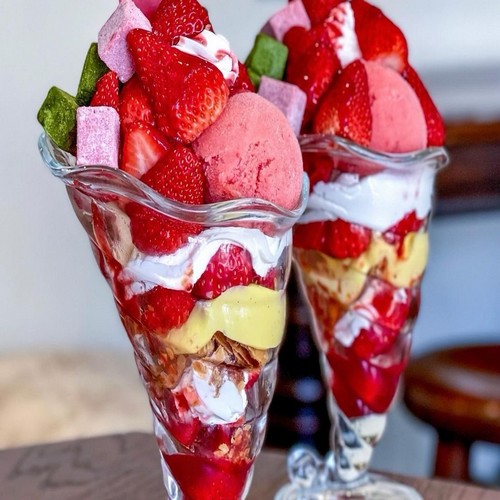 Serveret: med 3 kugler is, flødeskum, toping og jordbær